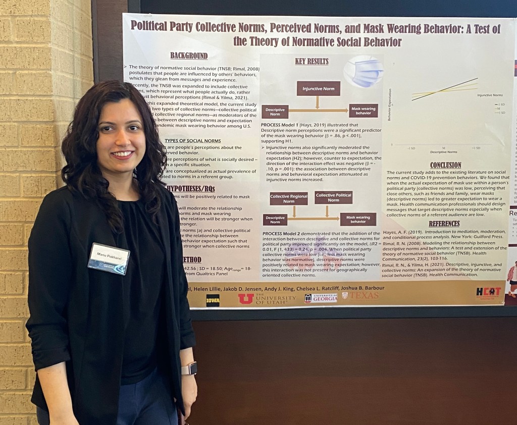 It is my great pleasure to the poster of our study titled–“Political Party Collective Norms, Perceived Norms, and Mask Wearing Behavior: A Test of the Theory of Normative Social Behavior” to the seventh annual Health Scholar Showcase Event 2023 hosted by the Translational Health Research Center at the Texas State University on March 3rd, Friday. The event features health-related research conducted by the Faculty of Texas State University across campus. Dr. Jennifer Sharpe Potter, the vice president for research and professor of psychiatry and behavioral sciences, was the keynote speaker this year. Her motivational talk focused on developing interdisciplinary grant-funded research teams and community health interventions.